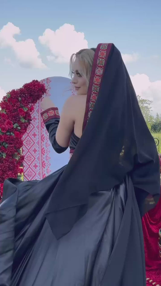 Palestinian Thobe Black Satin 2-Piece with Red Embroidery /Traditional & Modern Palestinian Dress