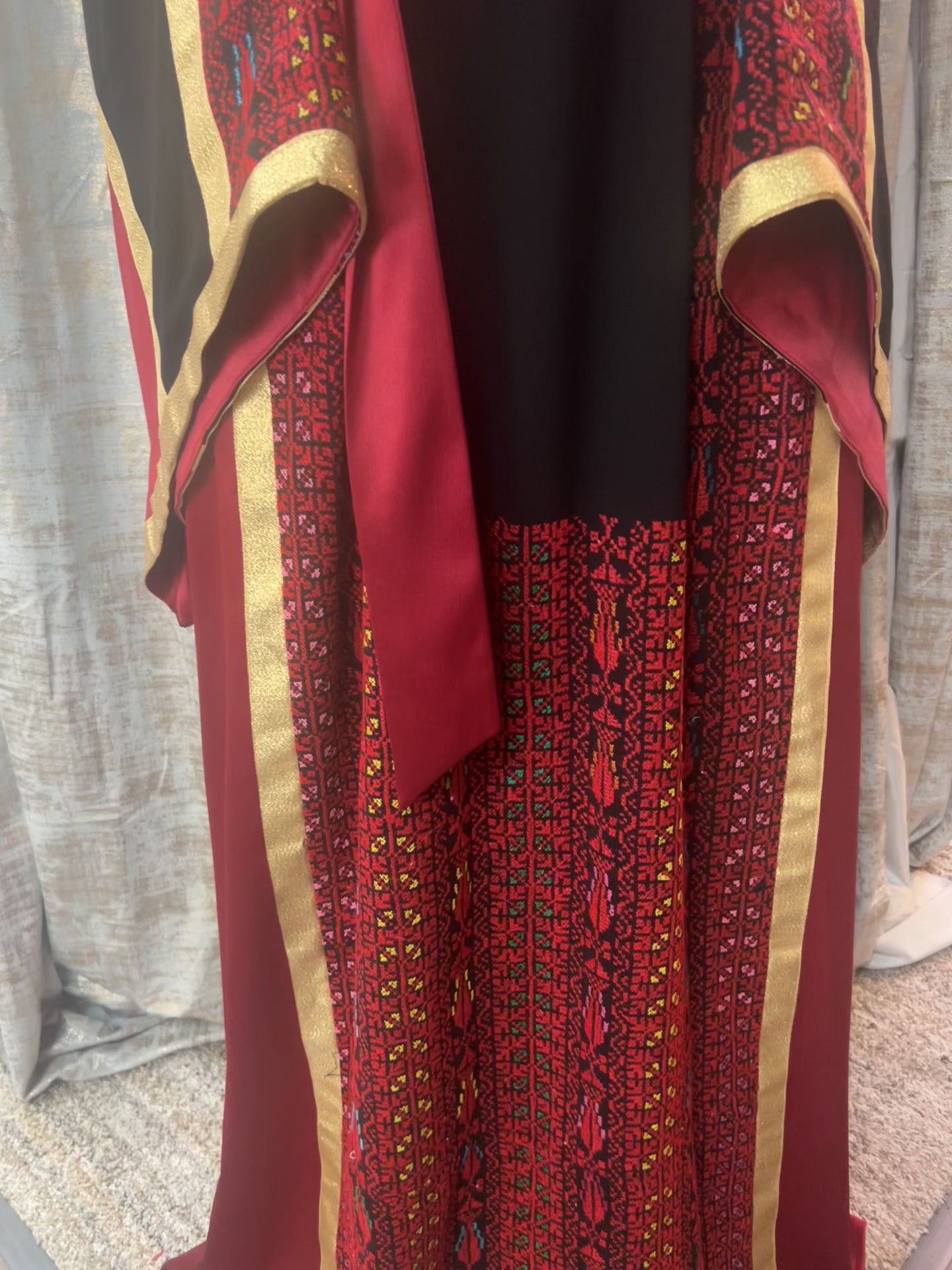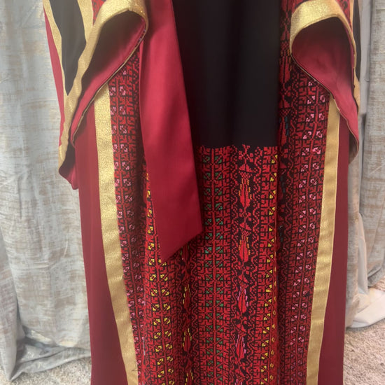 Black Crepe Palestinian Thoob with Red Handmade Embroidery and Gold Metallic Lines