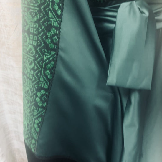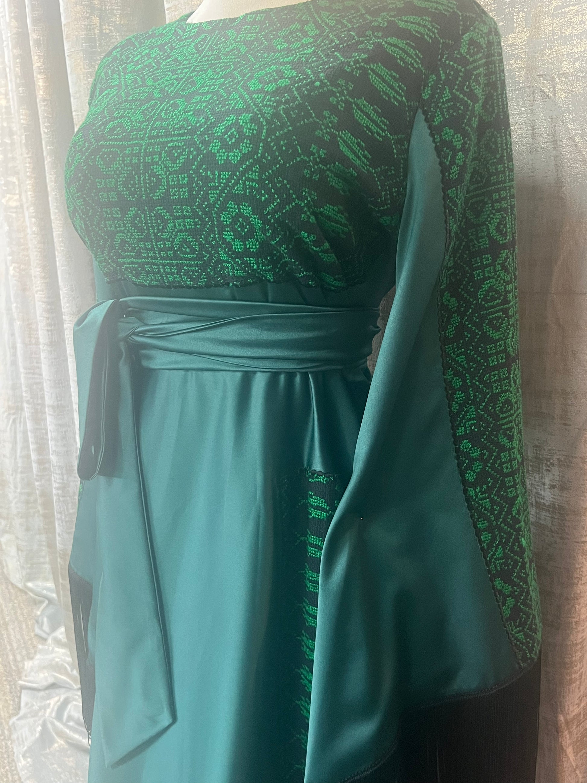 Green Modern Palestinian Thoob with Wide Cloches, Wide Sleeves, and Handmade Embroidery