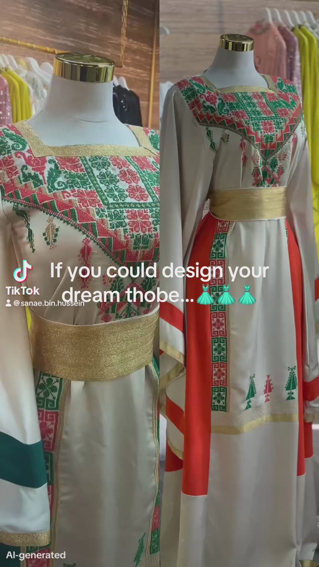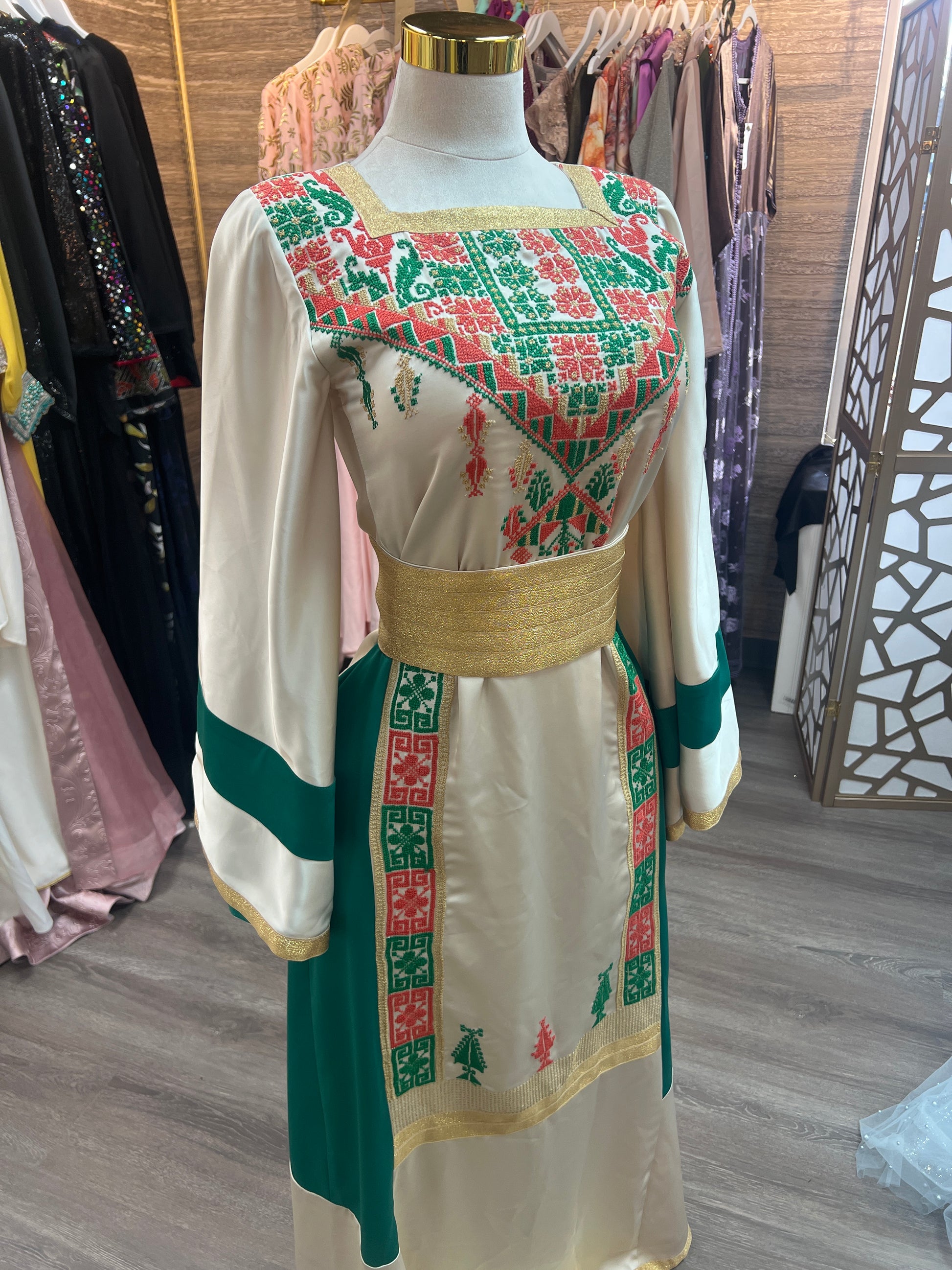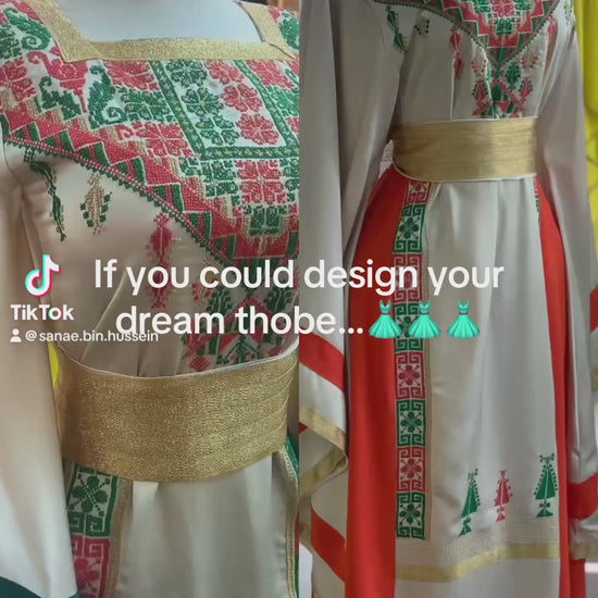 A refined beige Palestinian thobe crafted from luxurious Marlin fabric, adorned with exquisite handcrafted embroidery in rich shades of orange and green. Each stitch reflects authentic Palestinian heritage, elevated through a timeless silhouette and sophisticated color harmony. This statement piece embodies elegance, cultural pride, and artisanal masteryโ€”designed for the woman who values heritage reimagined through luxury.
