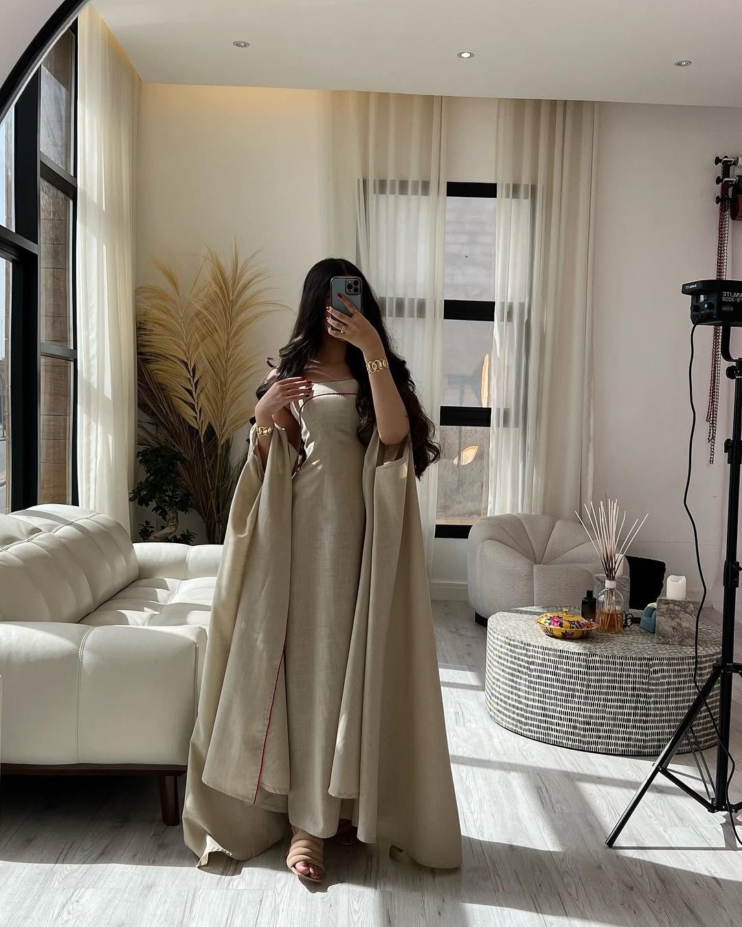 A modern strapless two-piece abaya set, crafted from luxurious fabric and adorned with exquisite Palestinian embroidery. The striking red embroidered detail at the back adds elegance and sophistication, creating a unique, refined, and culturally inspired look. Perfect for special occasions where style meets tradition.